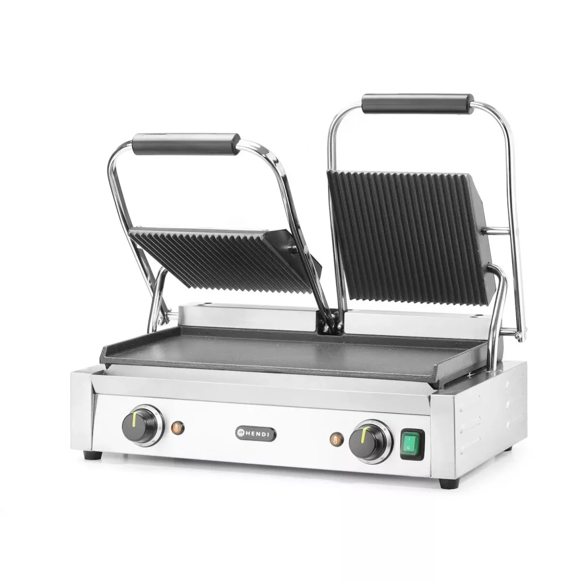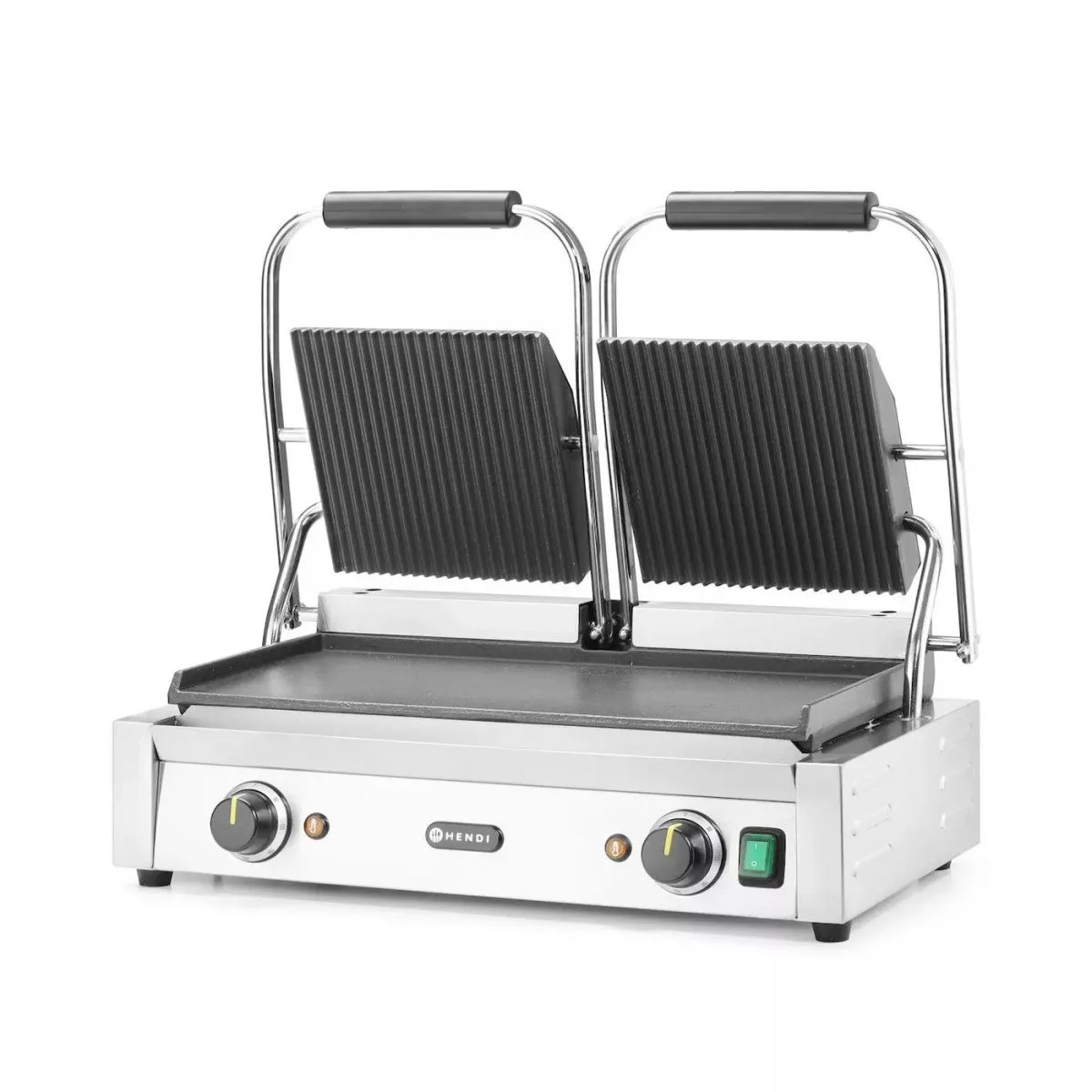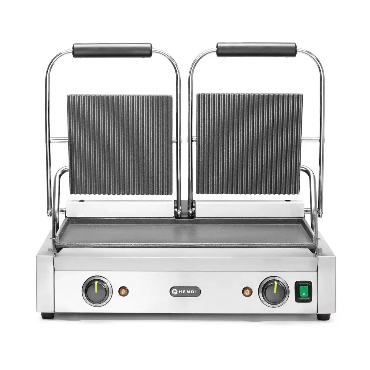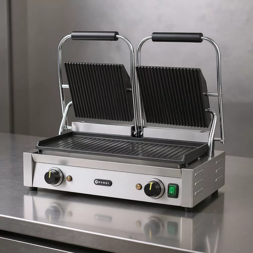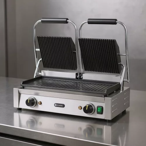 Kontaktgrill, dupla, bordázott tetejű és sima aljú, 230V/3600W, sütőfelület 47x23 cm