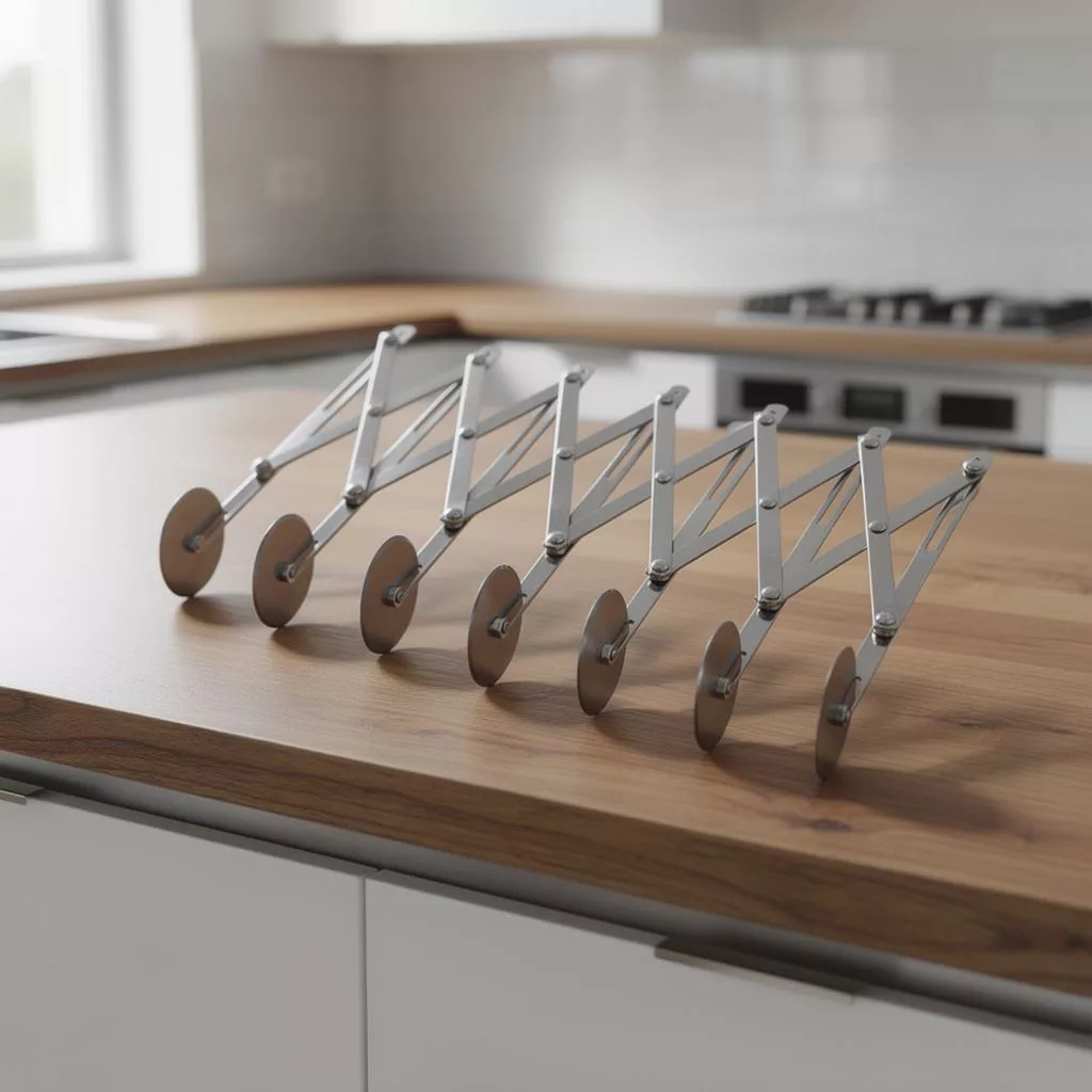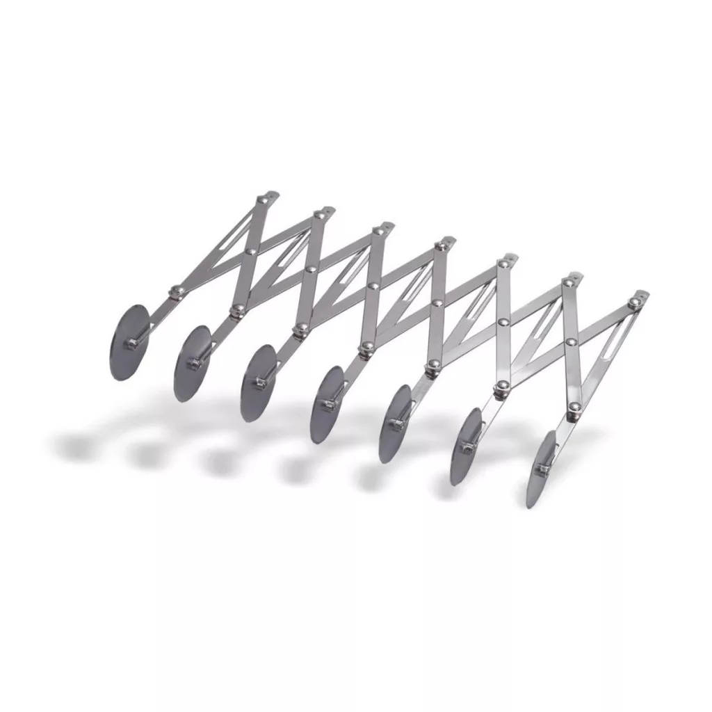 7 kerekes, sima tésztavágó és süteményosztó, rozsdamentes acélból. Az állítható kerekekkel 1,05-11,7 cm közötti vágási szélesség érhető el. Kiváló választás a pontos és egyenletes tésztacsíkok készítéséhez. Tartós kivitelezés, könnyű kezelés és tisztítás. Minden konyhában nélkülözhetetlen eszköz.