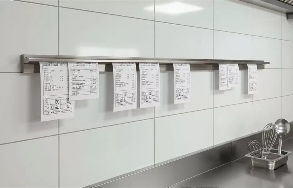 Rozsdamentes acélból készült, 120x8 cm-es professzionális blokktartó sín. A beépített golyós mechanizmus garantálja a rendelési blokkok biztonságos tárolását és könnyű kezelhetőségét.