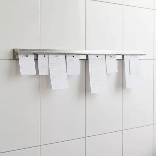 90x8 cm-es rozsdamentes acél blokktartó sín professzionális felhasználásra. A prémium minőségű rozsdamentes acél konstrukció maximális higiéniát és hosszú élettartamot biztosít. A beépített golyós mechanizmus garantálja a rendelési blokkok biztonságos tárolását és könnyű kezelhetőségét.