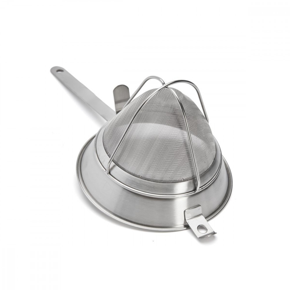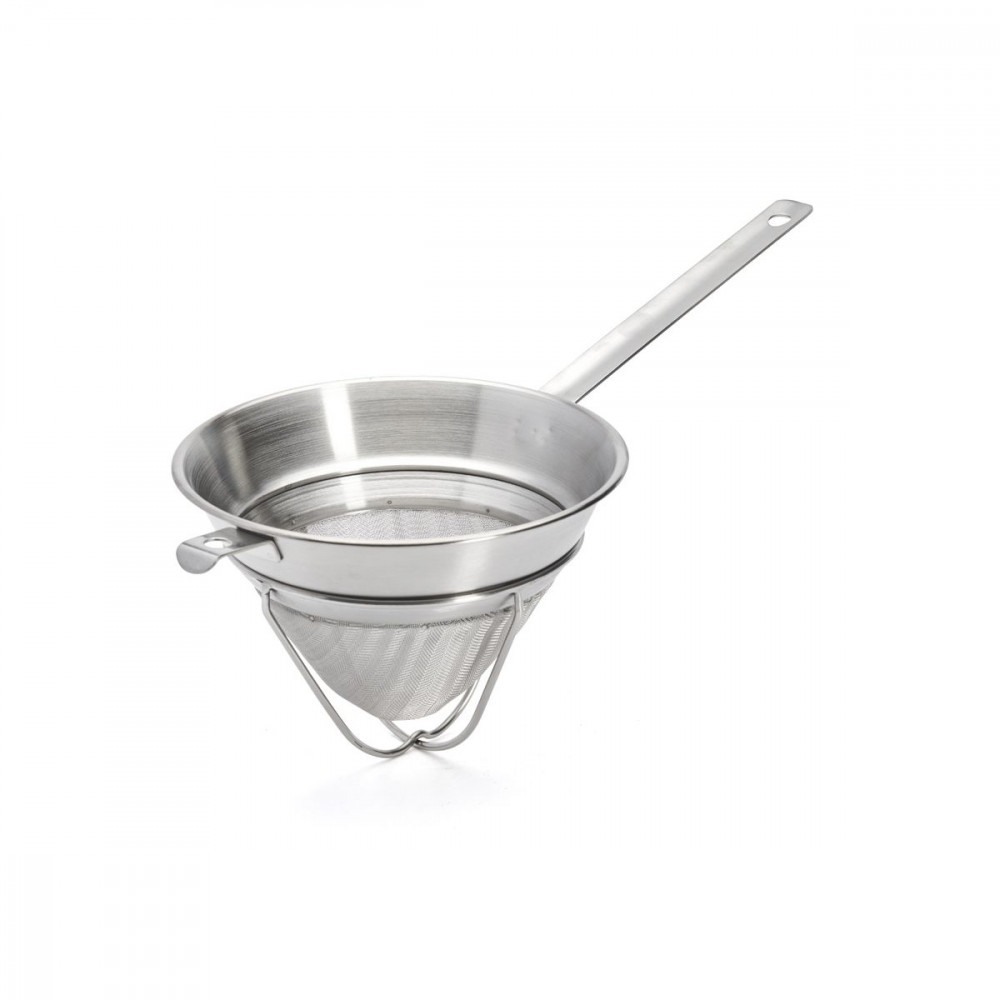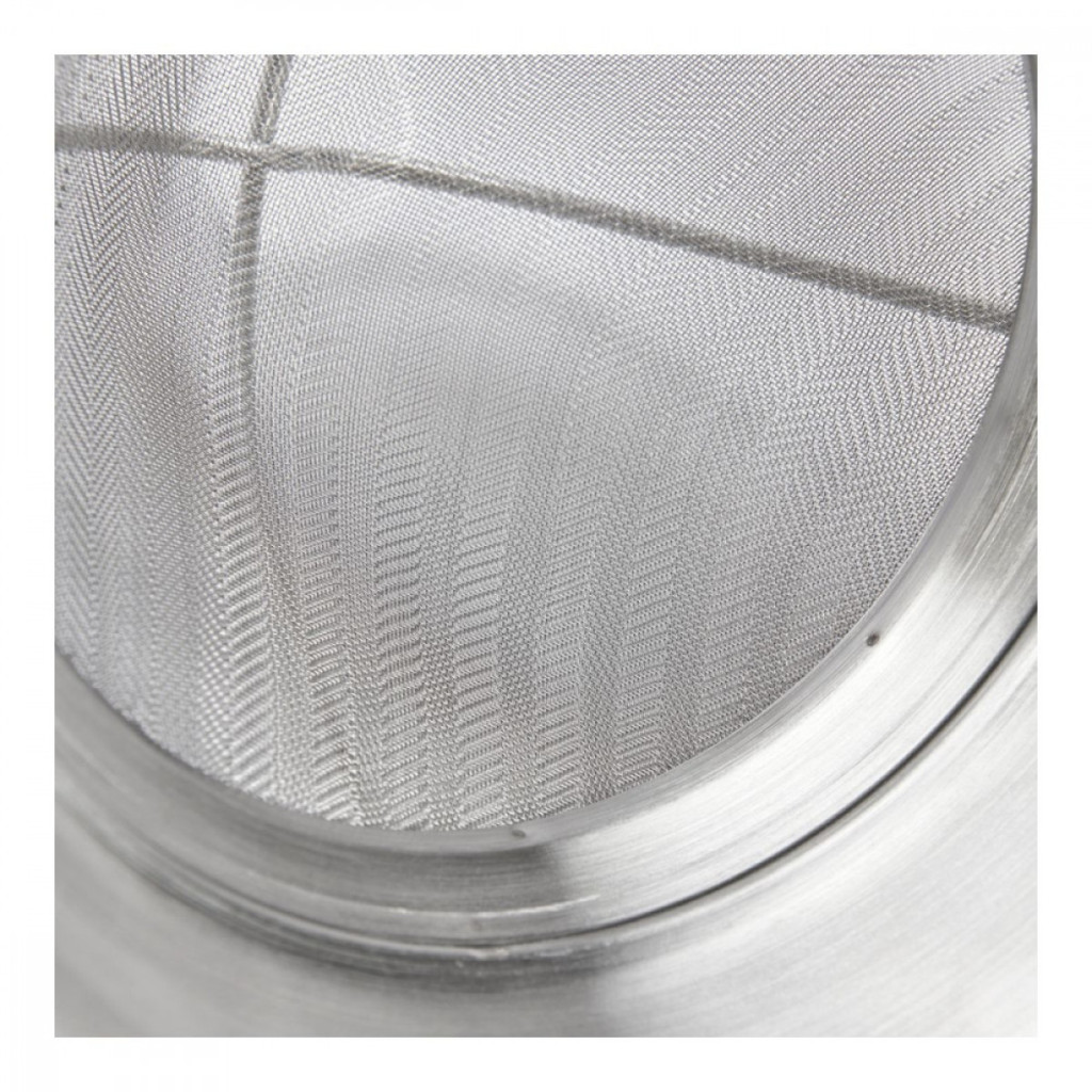 Cukrászati felhasználásra tervezett szűrő, ideális gyümölcszselé, puding, tea, tejszínhabosító készítmények, sorbetek készítéséhez. Rozsdamentes acélból készült, robusztus és tartós edény, intenzív használatra tervezve. Deformálhatatlan keret. A finom háló (lyukak átmérője 0,4 mm) lehetővé teszi a nagyon finom szűrést. Hegesztett, hosszú, ívelt és hajlíthatatlan nyél az ergonómikus fogás érdekében. A szűrőhöz hegesztett két rozsdamentes kampó lehetővé teszi, hogy a szűrőt egy edénybe helyezze anélkül, hogy a tartalma kiömlene. Higiénikus, könnyen tisztítható. Mosogatógépben mosható.