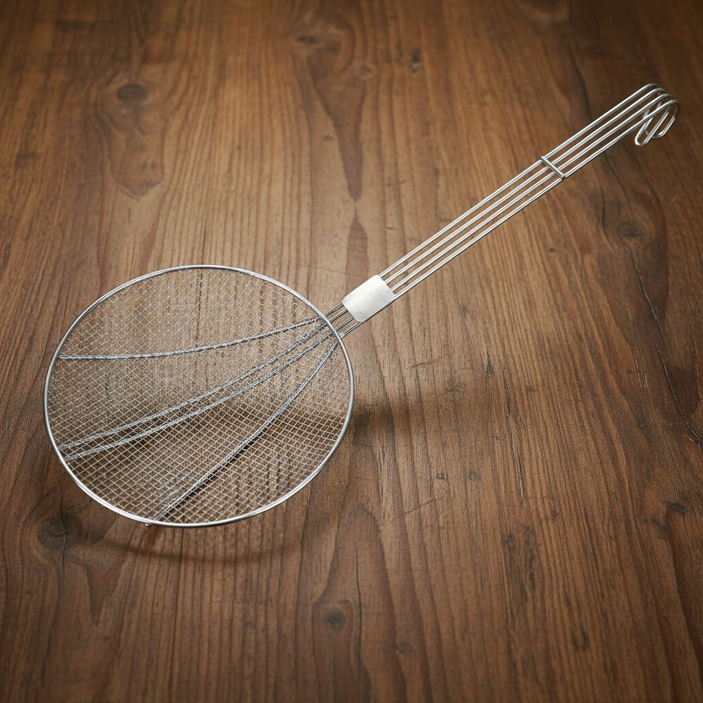 Professzionális rozsdamentes acél fritőzkanál nagykonyhák számára. Masszív, tartós kivitelezés a mindennapos használathoz.