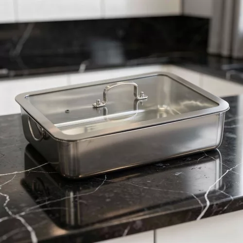 A praktikus üvegfedővel ellátott tepsi tökéletes választás otthoni sütéshez-főzéshez. A lehajtható fogantyúnak köszönhetően könnyedén befér a sütőbe. Az üvegfedő lehetővé teszi az étel ellenőrzését sütés közben. Ideális húsok, zöldségek és egytálételek készítéséhez.