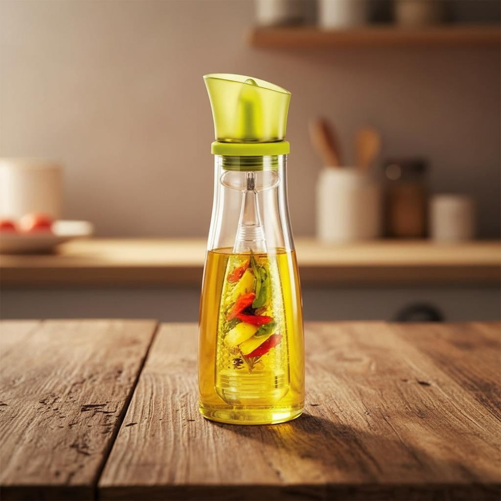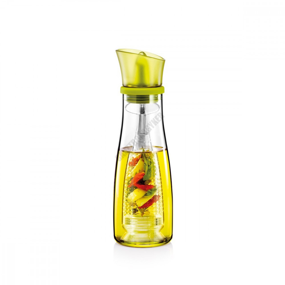 Kiválóan alkalmas fűszernövényekkel, fűszerrel, csili paprikával, fokhagymával és hasonlókkal ízesített olaj készítésére és tálalására. Az ízesített olaj tiszta marad, a szitában áztatott fűszerek nem keverednek bele. Első osztályú boroszilikát üvegből készült, rugalmas szilikonból és ellenálló műanyagból. Mosogatógépben tisztítható.