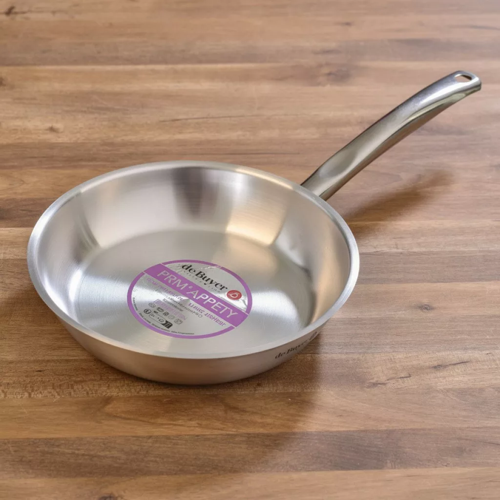 Az 1830-ban alapított francia de Buyer vállalat Prim'Appety termékcsaládjának serpenyője rozsdamentes acélból készült, szendvicstalppal rendelkezik, ezáltal bármilyen hőforráson használható, az indukciós főzőlapot is beleértve. A szendvicstalpas kialakítás lehetővé teszi a hő egyenletes eloszlását az edény alján. A több ponton hegesztett rozsdamentes acél nyél könnyű és kényelmes fogást biztosít. A serpenyő sima belső felületű, szatén fényű polírozással rendelkezik. Mosogatógépben tisztítható. Ne melegítse üresen és ne melegítse túl! Fokozatosan emelje a hőmérsékletet, mivel az edény érzékeny a hirtelen hőmérséklet-változásra!