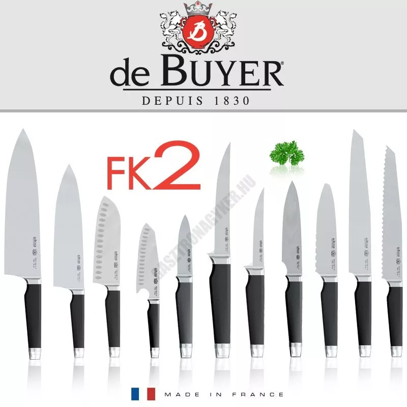 Az 1830-ban alapított francia de Buyer vállalat Fibre Karbon 2 termékcsaládjának 17 cm-es pengehosszúságú Santoku japán kése ideális a nyers hús és a hal kiváló simaságú darabolásához, filézéséhez vagy kicsontozásához. A késen található méhsejtes vágás légzsebeket hoz létre, ami megakadályozza a finom vagy puha hússzeletek hozzátapadását a pengéhez. Könnyű és nagyon jól kezelhető. Tökéletes zöldségek vékony szeletelésére is.