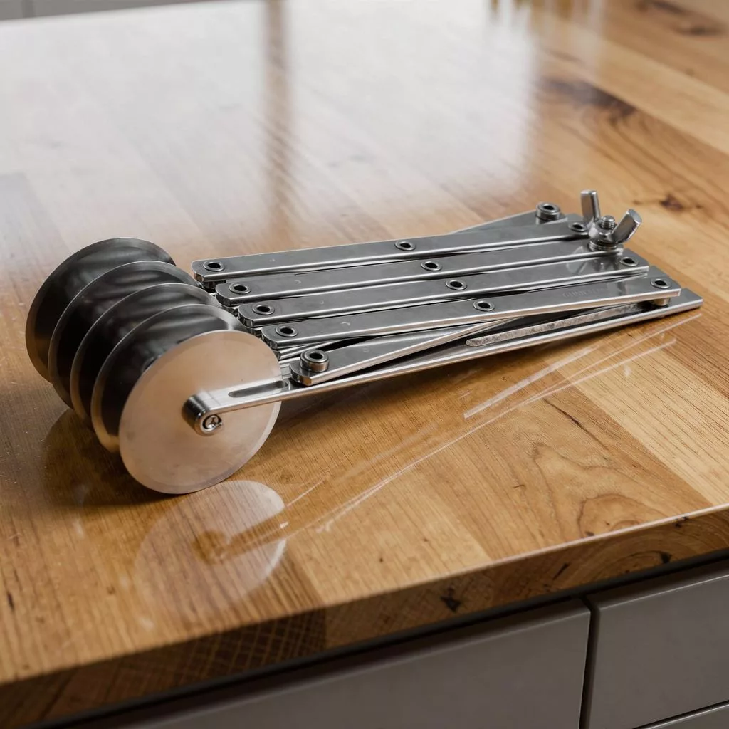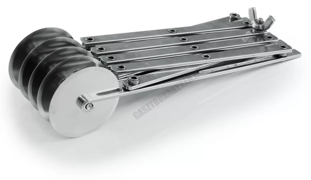 5 kerekes, sima tésztavágó és süteményosztó, rozsdamentes acélból. Az állítható kerekekkel 1-12 cm közötti vágási szélesség érhető el. Kiváló választás a pontos és egyenletes tésztacsíkok készítéséhez. Tartós kivitelezés, könnyű kezelés és tisztítás. Minden konyhában nélkülözhetetlen eszköz.