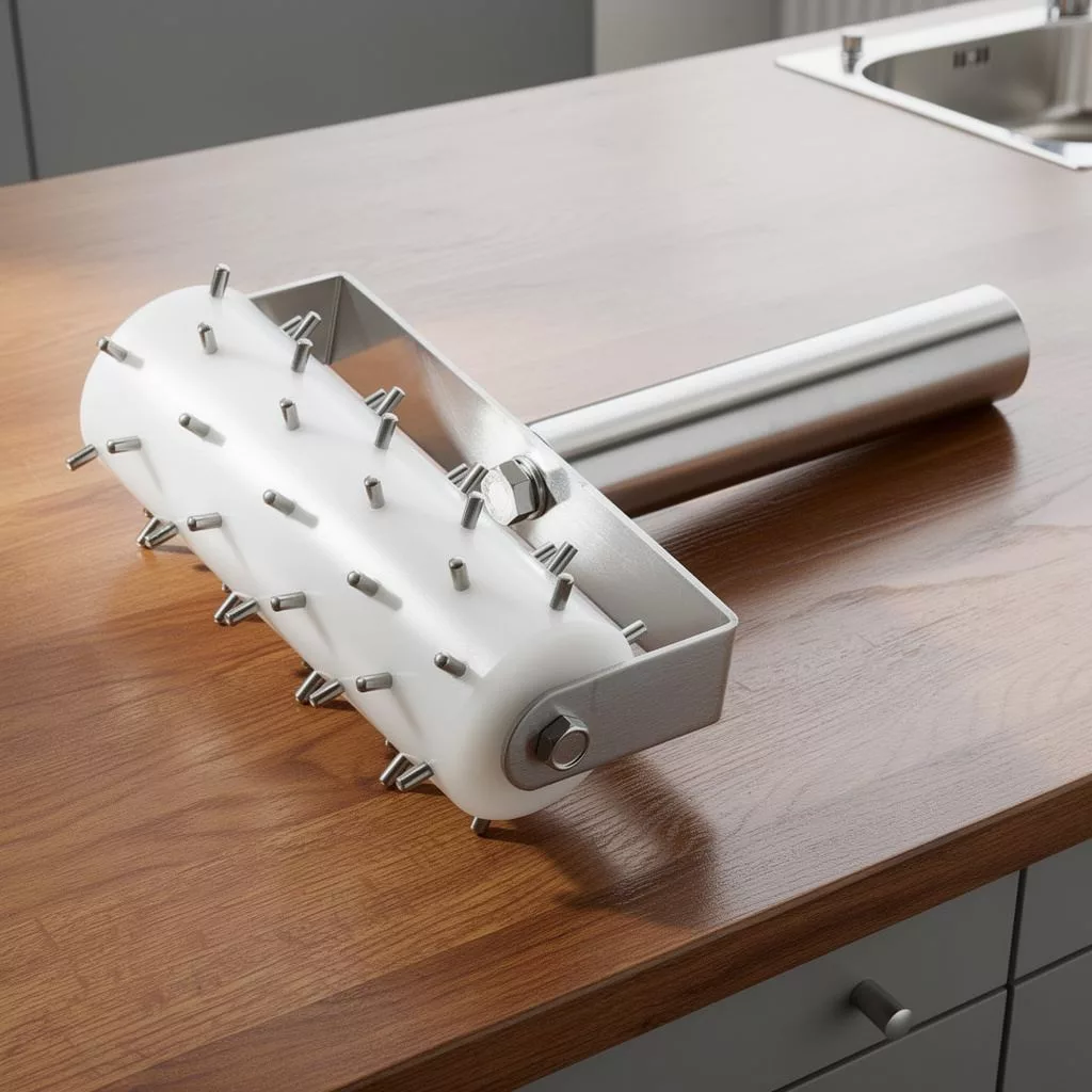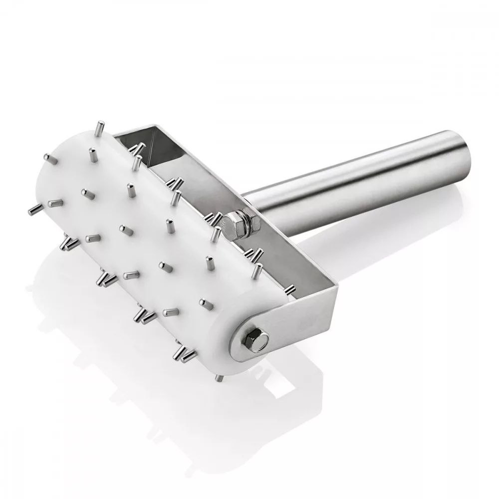 Tüskés tésztavágó, 14 cm hosszú, rozsdamentes acélból készült. A 0,5 cm hosszú tüskék lehetővé teszik a tészta könnyű átszúrását. Mérete 20,5x14 cm, ideális a nagyobb tésztadarabokhoz. Tartós kivitelezés, könnyű kezelés és tisztítás. Minden konyhában hasznos segédeszköz.